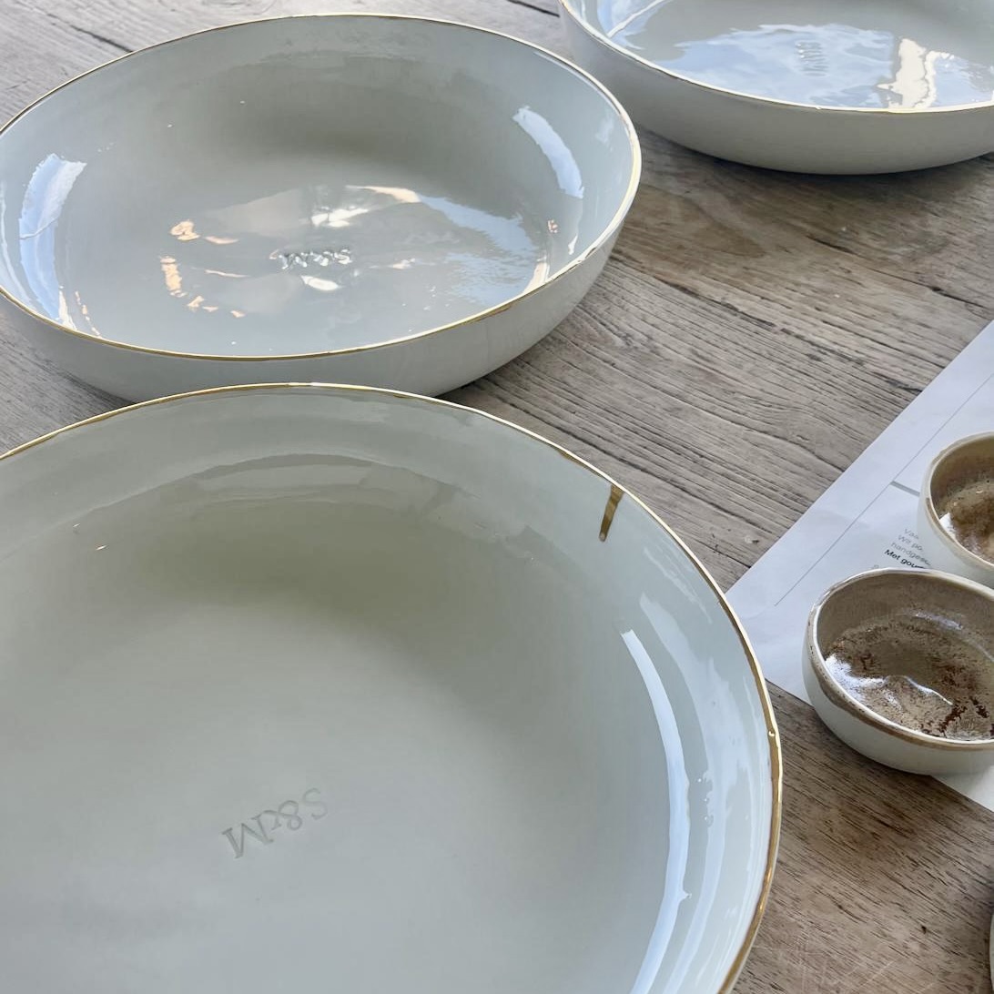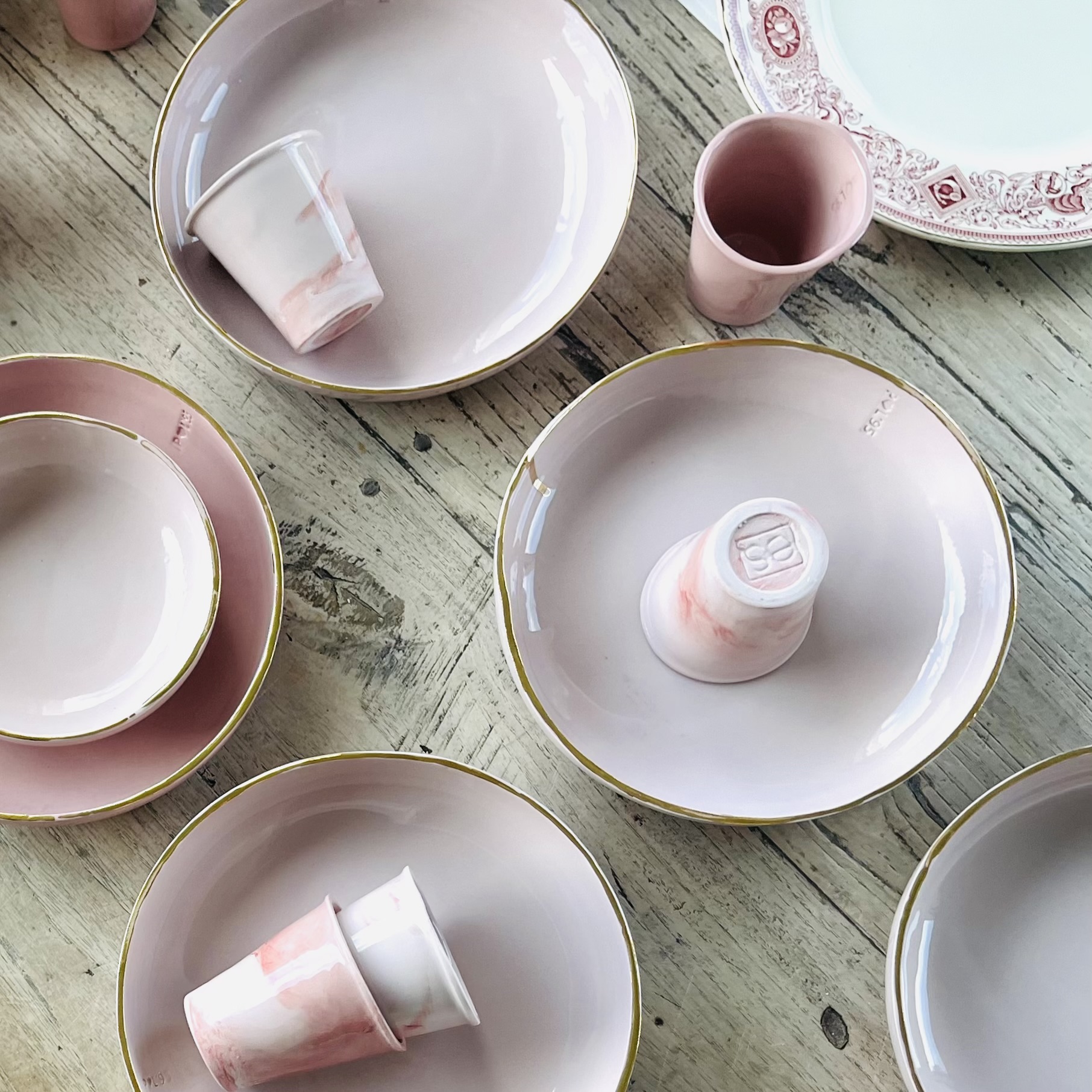 Wat een super mooi resultaat! Na een leuke gastvrije ontmoeting en het bespreken van de mogelijkheden kwam Esther met een voorstel. De heerlijk drinkende koffiebekertjes en pastaborden met gouden rand passend bij ons bestaande servies. Dit is het begin van een mooie collectie. Speciaal voor ons 30 jarig huwelijk is er een stempel gemaakt. Dit komt prachtig uit in het roze porselein. We gaan het gewoon elke dag gebruiken!