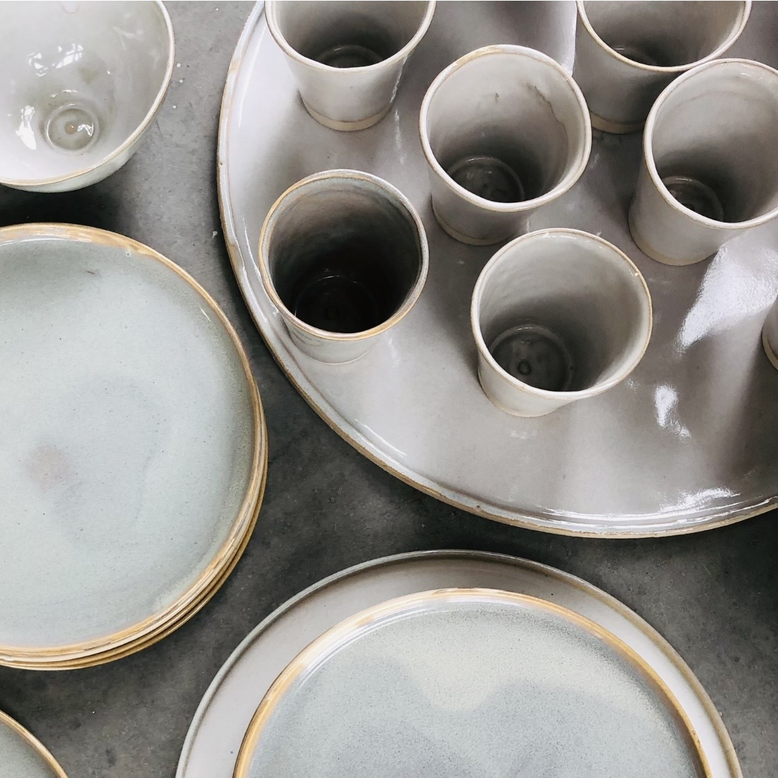 We had specific ideas about shapes, dimensions, and colors for the tableware we envisioned. A visit to Esther's studio immediately inspired us to stray from our original plan and embrace the blue-and-gold combination with a subtle touch of pink. Thoughtful conversations with Esther figuratively shaped the collection and, ultimately, brought it to life.